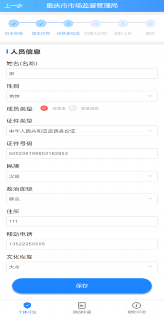 录入经营者信息,确认无误后点击【保存】,然后点下一步