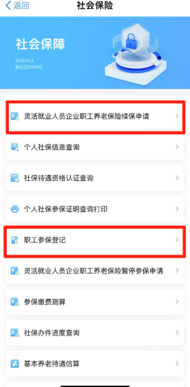 2、选择“社会保险”中的“职工参保登记”或是“灵活就业人员企业职工养老保险续保申请”栏目。
