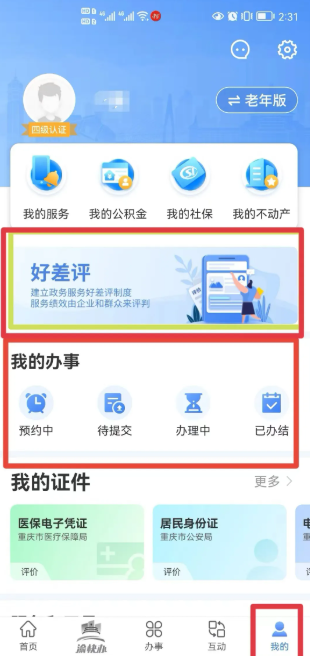 1、注册重庆市政府 APP(渝快办),完成高级身份认证