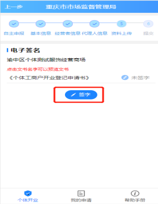 如果当前经办人是经营者本人,直接点击签字 ,跳转到如下图界面,点击签字,完成后续签字即可