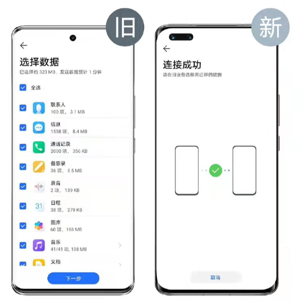 4、根据指引扫描新设备上的二维码,连接之后,旧手机上的数据就能传输到新设备了。