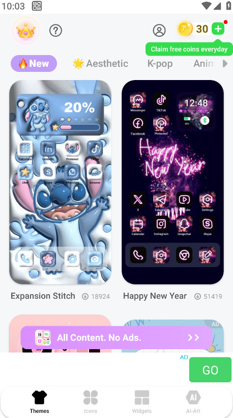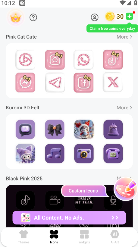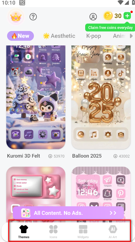 Themepack是一款专为 Android 设备设计的个性化主题工具,提供超过 10,000 种精美小部件、图标和壁纸。您可以通过自定义图标、调整字体、颜色和透明度,轻松打造独特的主屏幕设计。无论是电池小部件、时钟、天气还是动态图像效果,丰富的功能让您的屏幕焕然一新!支持一键更换主题,让您的设备更加个性化,尽显品味。