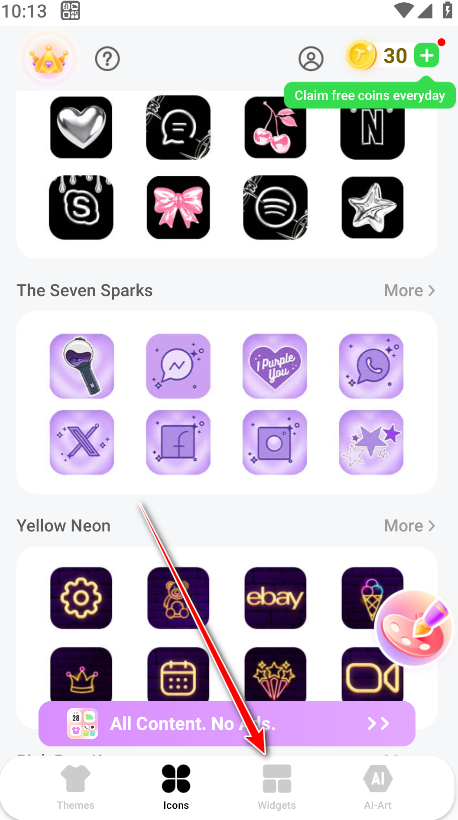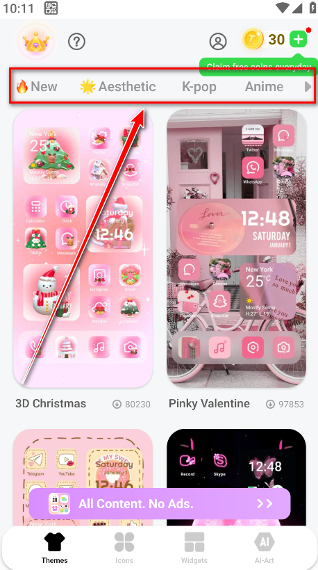 1.打开Themepack,可以看到有四大板块内容,依次是主题、图标、小工具、ai艺术创作。