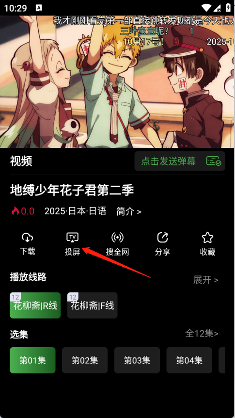 1、点开动漫进入播放页面,点击投屏。