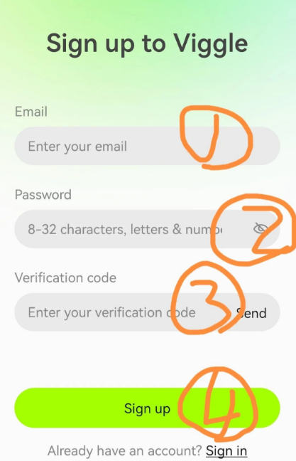 1、填写自己的邮箱,输入密码,点击Send(打开邮箱复制验证码),粘贴验证码,点击Sign up