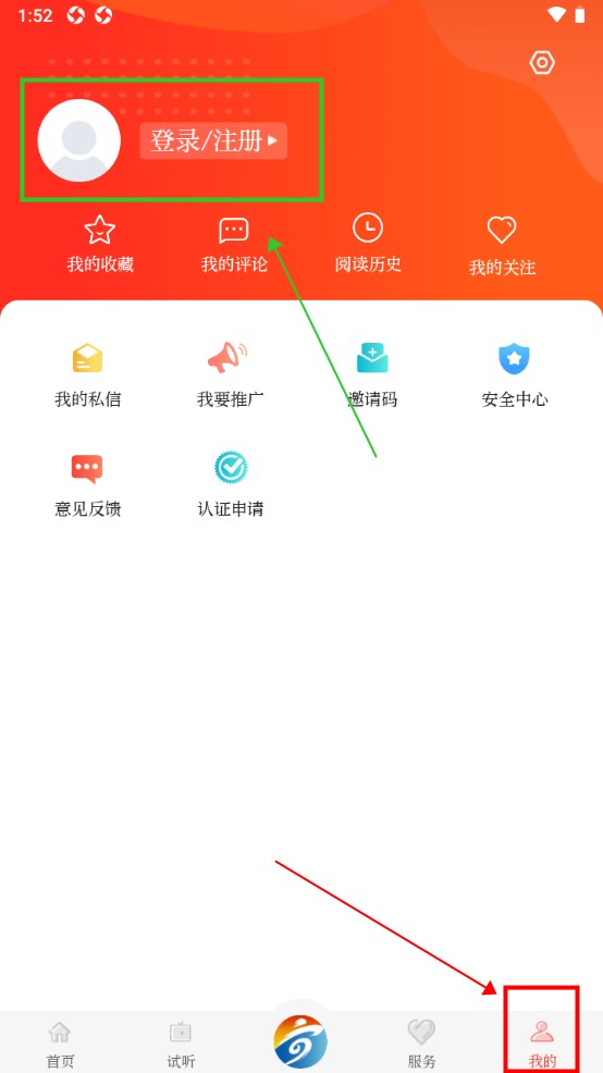 2.进入软件点击右下角我的按钮,以及上方登录/注册按钮。