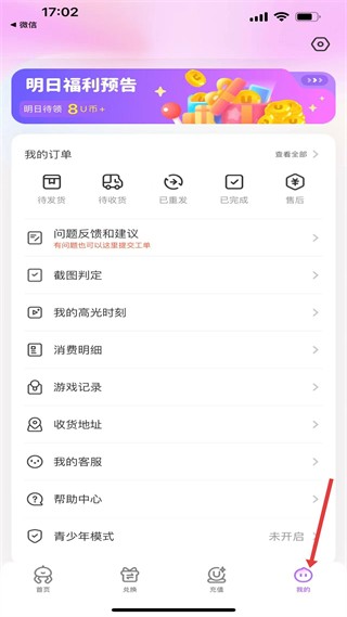 4、我的页面,有明日福利预告,可查订单、反馈问题、看消费明细等,还可设置收货地址、联系客服、开启青少年模式。