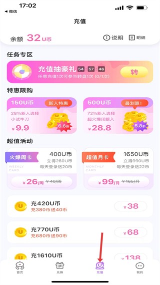 3、充值页显示U币余额,有任务专区、特惠限购、超值活动板块,提供多种U币充值套餐及周卡、月卡选项。