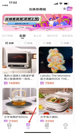2、兑换券商城,有双11钜惠等分类,商品涵盖家电、潮玩等,如美的微波炉、Labubu玩偶,可凭兑换券兑换。