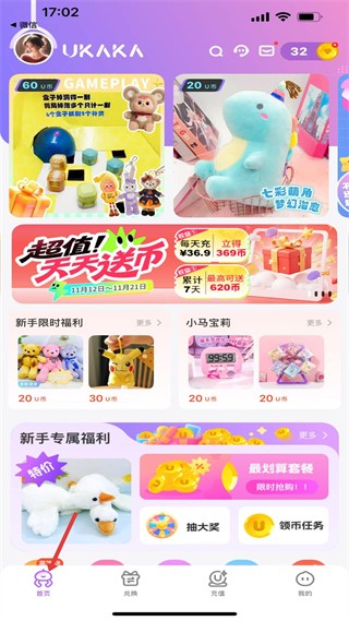 1、首页展示毛绒玩具等商品,有超值天天送币活动,设新手限时福利、小马宝莉等板块,提供不同U币兑换商品。