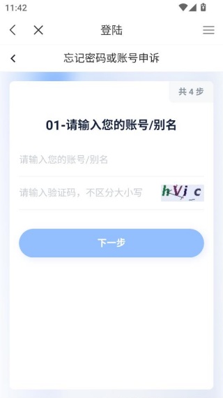 4、忘记密码的用户们,只可以在这里填写账号或者别名加验证码,进入下一步操作即可。