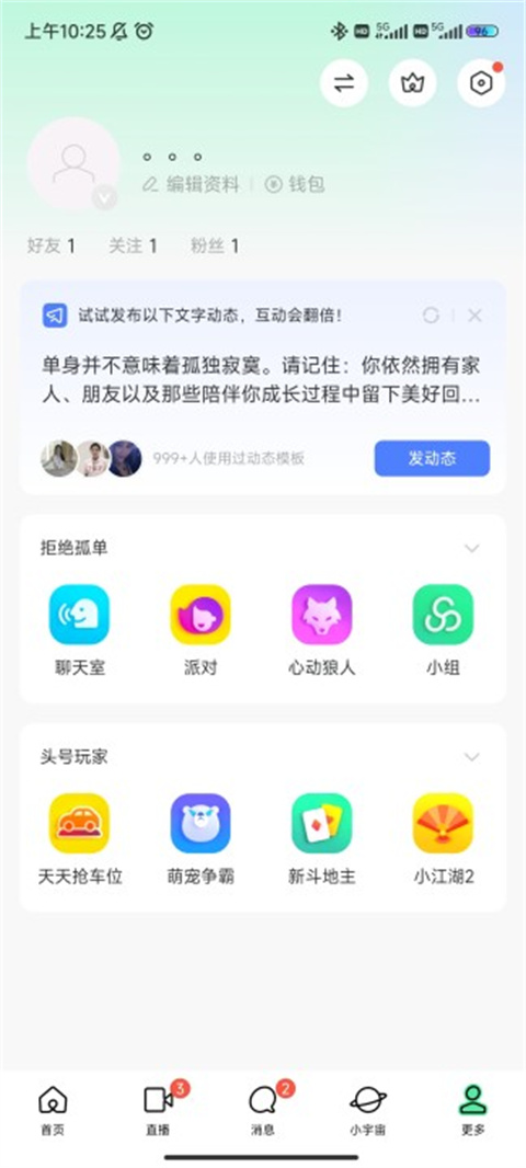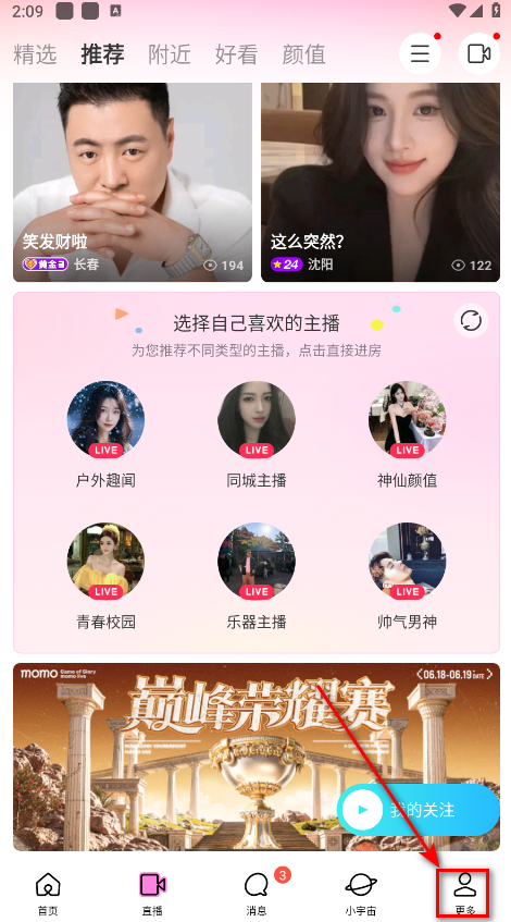 1、打开陌陌“更多”页面,点击右上角的小齿轮图标进入。