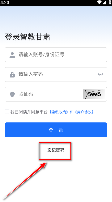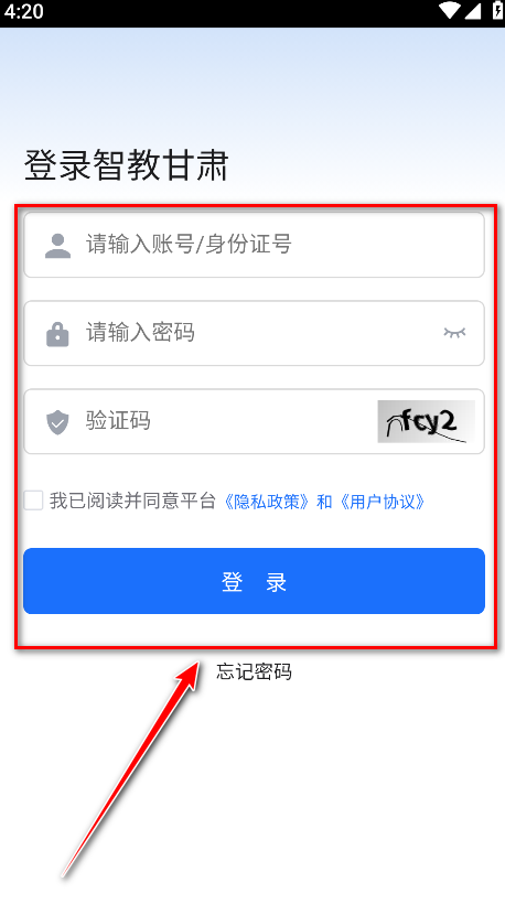 1.打开甘肃智慧教育云平台,请输入账号/身份证号码、密码、验证码,勾选我已阅读并同意平台《隐私政策》和《用户协议》,点击登录即可。