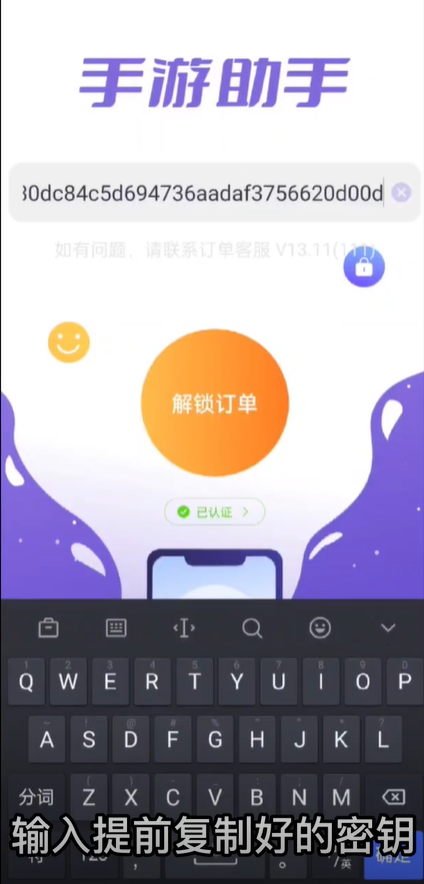 4.点击下单之后会出现密钥,通过复制密钥就能成功的通过手游助手登陆了。