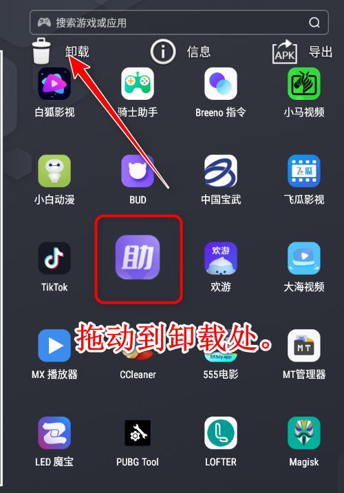 在你的手机上长按手游助手图标,拖动到卸载处或者在二级菜单中选择卸载即可成功。