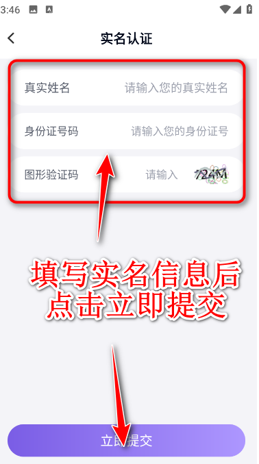 2.进入实名认证界面,填写实名信息后点击立即提交。