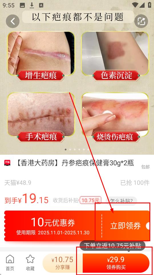 2.在商品详情页点击【立即领券】,领取优惠券后点击【领券购买】,就能优惠购买啦。