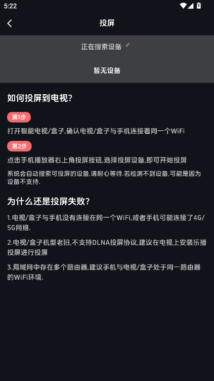 4.打开智能电视/盒子,确认电视/盒子与手机连接着同一个WiFi。选择投屏设备,即可开始投屏。(需要注意的是系统会自动搜索可投屏的设备,请耐心等待)