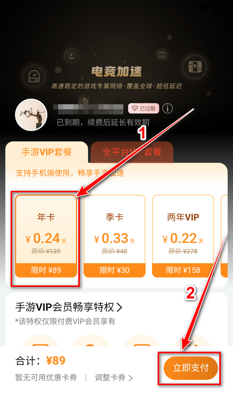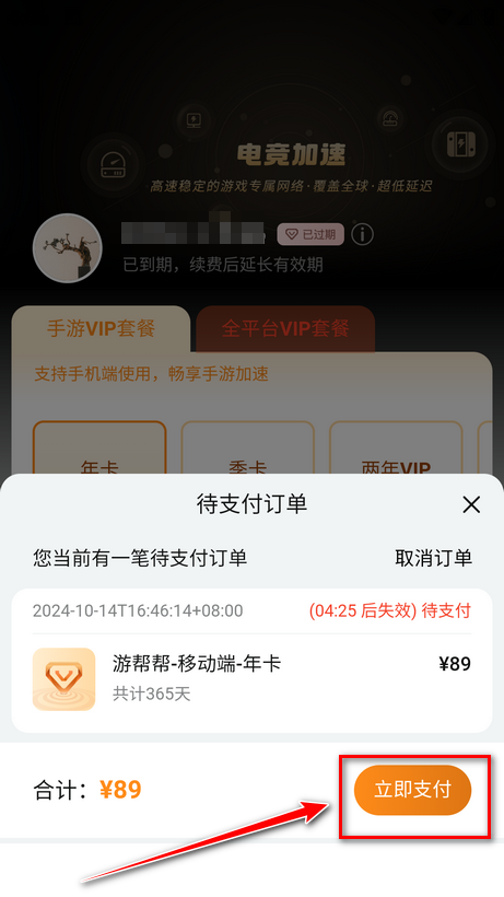 3.随机选择一个套餐,这里小编选择的是年卡,然后点击立即支付。