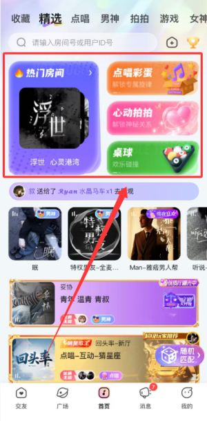 4.首页展示热门聊天室、点歌互动及照片分享等实时社交娱乐内容。