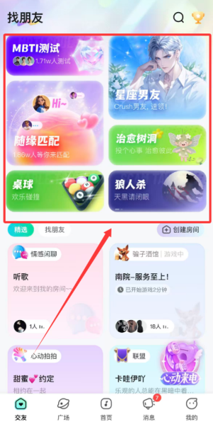 3.交友板块提供随机匹配、倾诉空间、星座交友及多种互动游戏等功能。