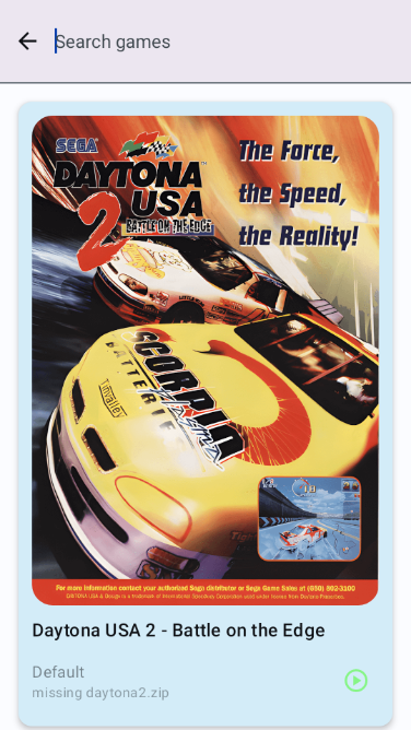 6.进入游戏详情页面,例如《Daytona USA 2-Battle on the Edge》,可查看游戏封面、名称及所需文件状态。点击右侧播放按钮即可启动游戏。