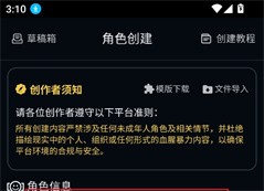 2.点击“创作”按钮进入角色创建页面,系统提示需遵守创作规范,确保角色设定符合平台要求,并可选择使用模板或导入文件进行快速创建。