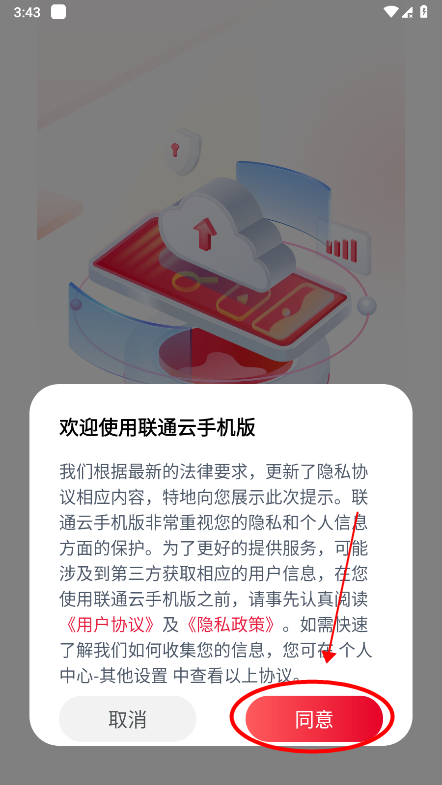 1、打开app,需要阅读用户协议和隐私政策,然后点同意;