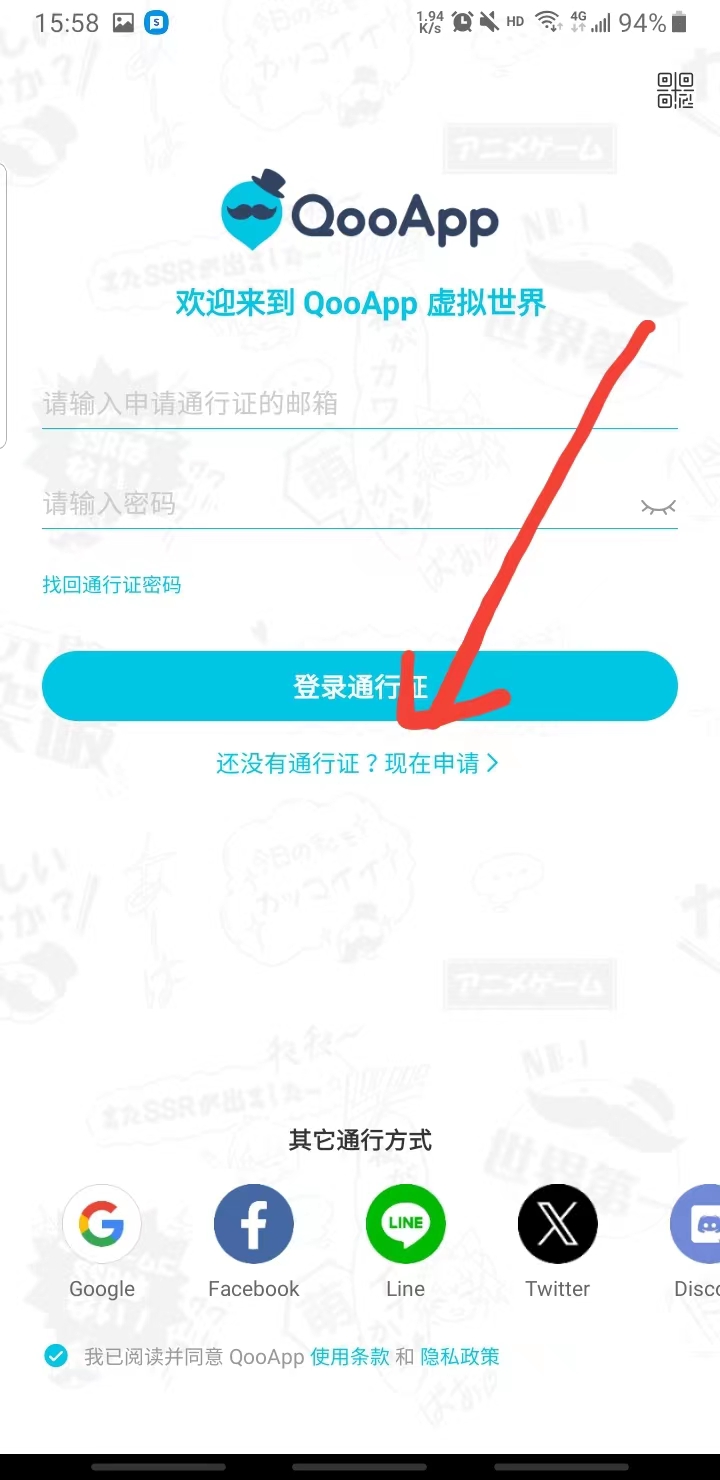 1.首先在蜻蜓手游网中搜索qooapp,并在本页面点击普通下载,获得最新版的qooapp安装包,打开到登陆界面点击申请通行证