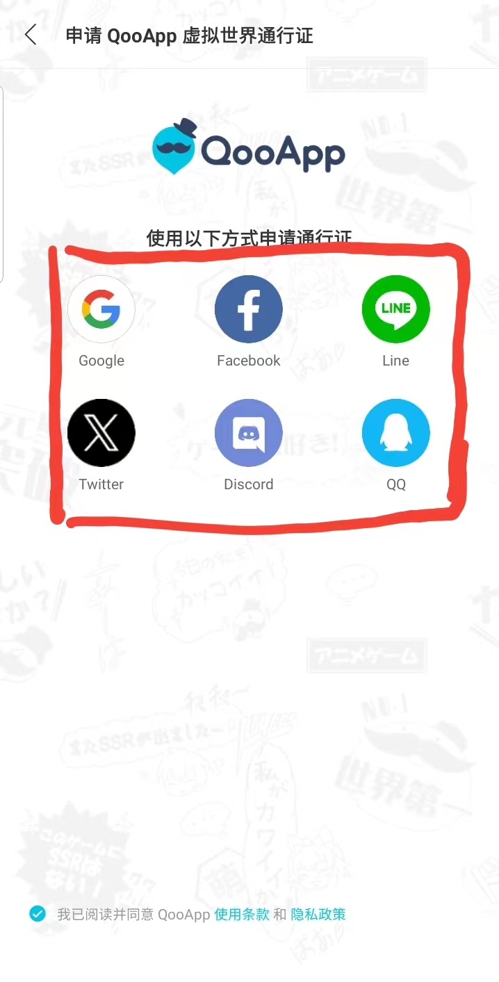 3.进入通行证申请界面,选择自己拥有的账号点击就可以进行授权,qooapp现在共支持6个方式,可以满足大部分人的需求,我们以qq为例子