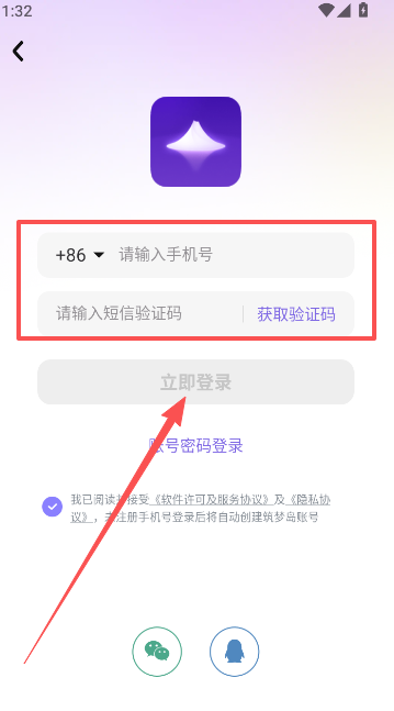 3、输入手机号码,填写短信验证信息立即登录。