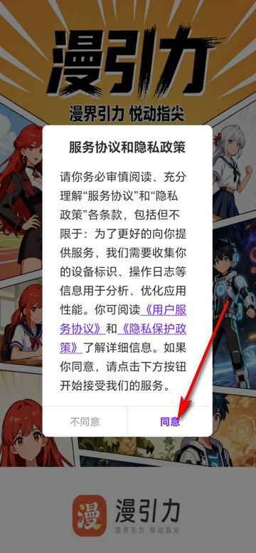 1、打开漫引力app,点击同意