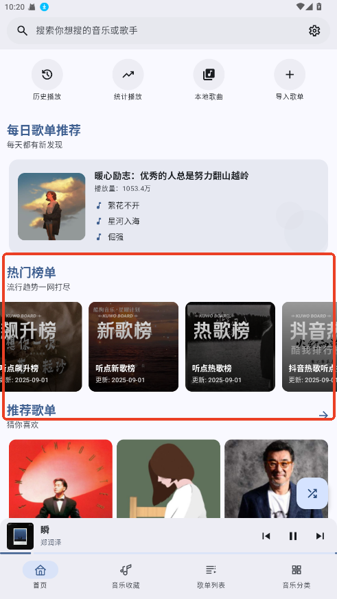 1.进入首页即可浏览热门歌曲、歌单和推荐榜单。
