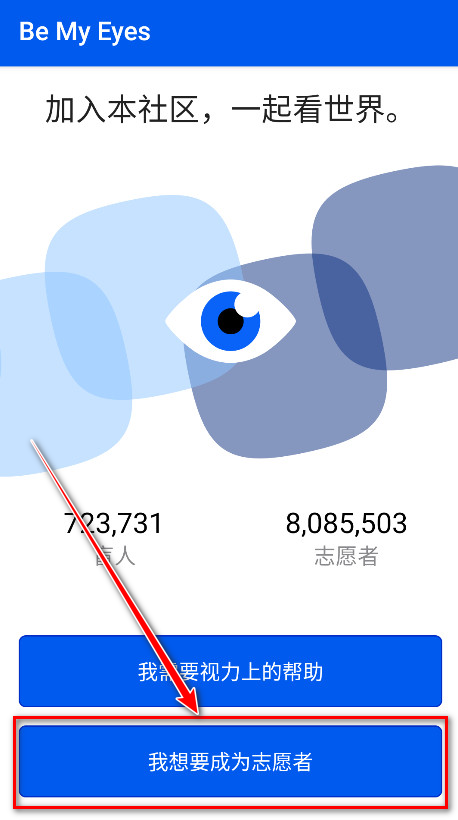 be my eyes是一款可以让盲人的世界充满美好的软件,成为盲人的眼睛。新手登录这款软件会让我们选择成为志愿者或者是视觉帮助者,我们需要根据自己的真实情况来注册信息,如果是健康的,就可以登录去帮助更多有需要的人了。
