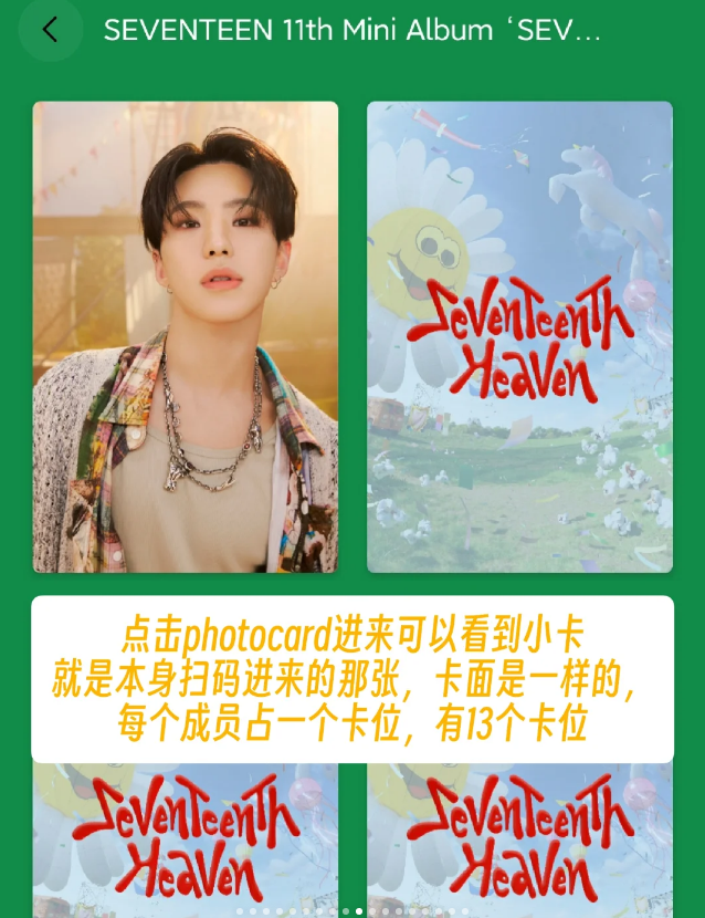 7、点击photocard进来可以看到小卡就是本身扫码进来的那张,卡面是一样的,每个成员占一个卡位,有13个卡位