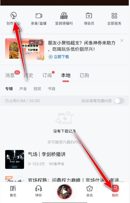 1.打开喜马拉雅APP,在首页下方的右下角找到账号点击进入,然后点击左上方的创作中心。