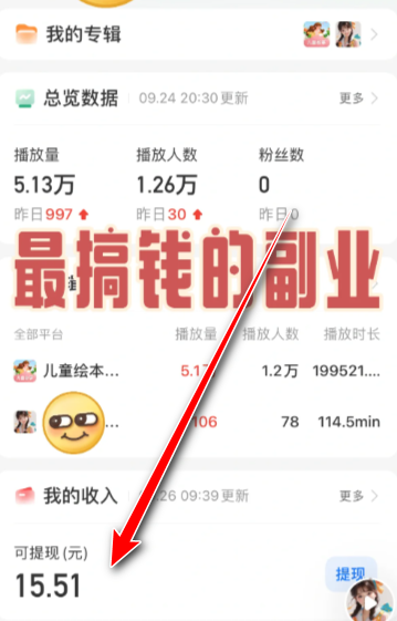 5.当你的专辑有很听友来听获得人气后就能提现了。