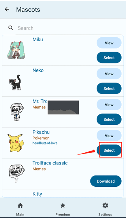 2.然后挑选一个自己喜欢的桌宠,并点击Select(Select按键只有下载桌宠后才会显示,如果没有显示Select按键,点击Download按键下载后就会显示啦)