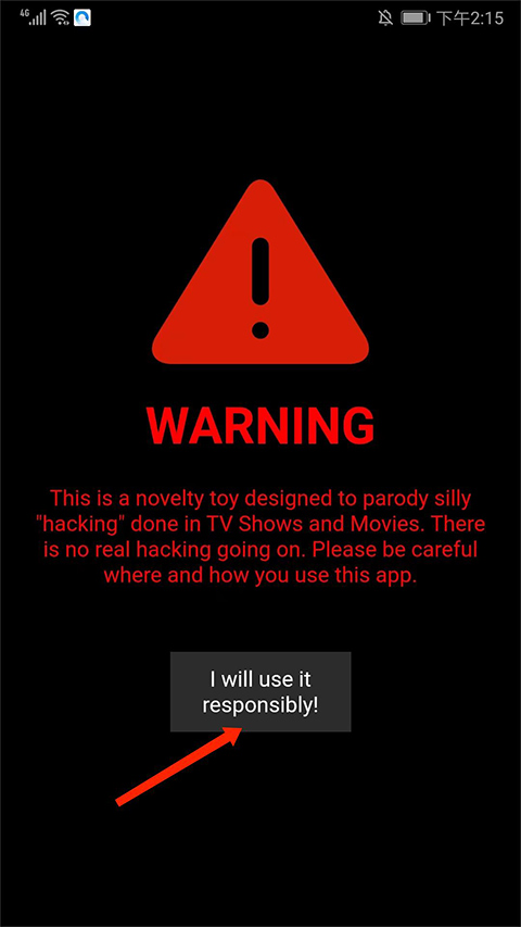 1、打开geektyper手机版,进入应用主界面就有一种黑客的感觉了,点击下方【I will use responsiblly】提示,