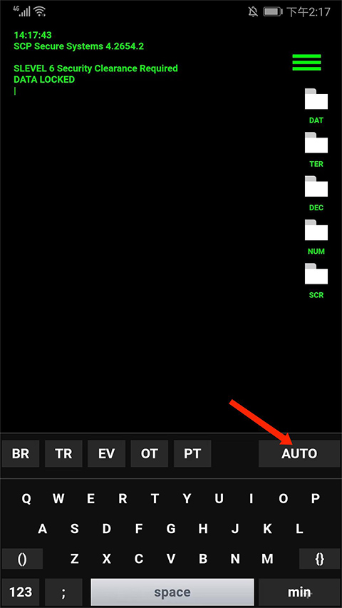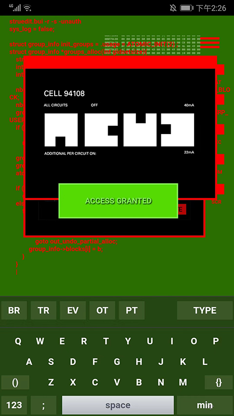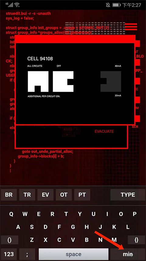 7、选择右下角【min】选项,就可以把键盘隐藏,点击【+号】图标就可以恢复键盘,这样是不是显得更像一名专业的黑客了,以上就是geektyper手机版的用法了。
