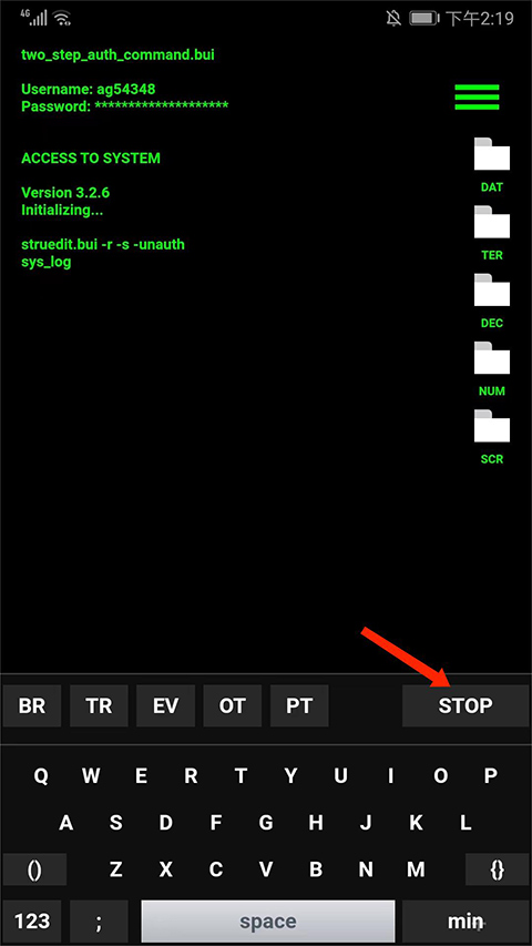 3、可看到代码编辑界面会自动输入并且滚动代码,我们点击【STOP】选项,即可暂停自动输入,