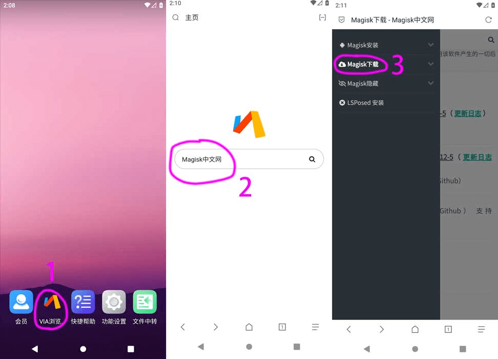 3、打开Via浏览器– 搜索 Magisk中文网 – 下载稳定版Magisk – 安装Magisk