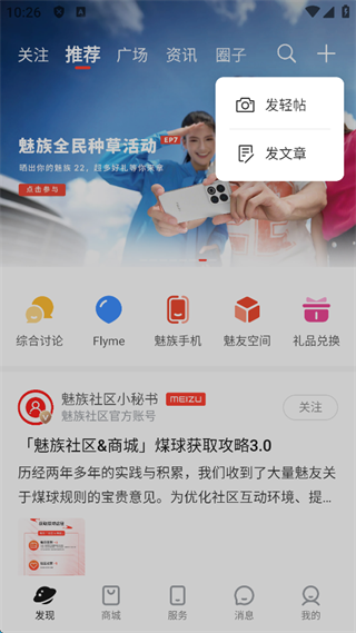 魅族社区app是珠海星纪魅族信息技术有限公司为广大魅族手机用户打造的一款一站式服务平台,主要有综合讨论、魅族手机、摄影天地、礼品兑换、Flyme、服务支持等多种内容板块,比如服务支持包含了产品注册、寄送快修、上门服务、真伪查询、配件价格、维修查询、增值保障、自助服务等等。