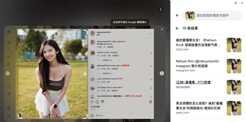 如果选择的内容是图片或视频(本质也是视频截图),那么浏览器就会自动按图片搜索相关内容资讯。比如你想了解这个“当男朋友心情不好时你该怎么安慰”这个热门视频的女主资料,就可以通过在视频中圈定关键性的图片帧来进行搜索,取得结果。