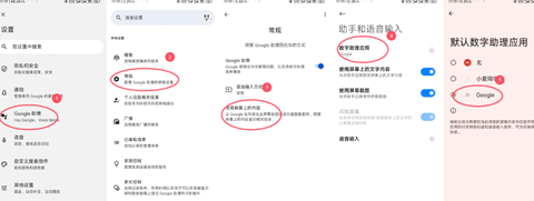 打开Google找到设置里面的Google助理,打开Google助理;点击常规--使用屏幕上的内容--数字助理应用;选择Google。