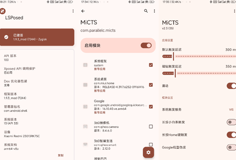进入LSPosed框架打开MiCTS模块,把系统框架、系统桌面、Google三个选项打上对勾,重启手机后重新开启谷歌和框架模块,正常就可以启用了。