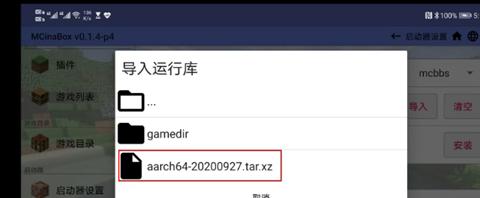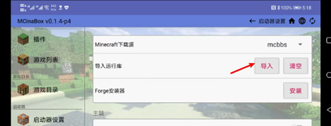 2、接着打开APP,找到启动器设置,点击导入运行库,然后找到MCinaBox文件夹,点击运行库文件。