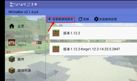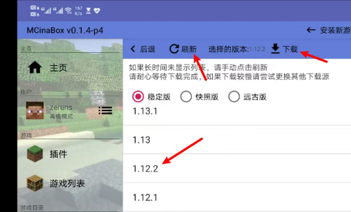 4、然后安装游戏版本,点击游戏列表,安装新版本游戏,再点一下刷新,选择版本1.12.2,然后点下载,接着就等下载完成。