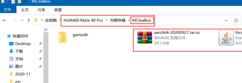 1、安装好启动器APP后将手机用数据线与电脑连接,将上面下载的运行库文件aarch64-20200927.tar.xz和forge包文件forge-1.12.2-14.23.5.2847.jar复制到手机里的MCinaBox目录。