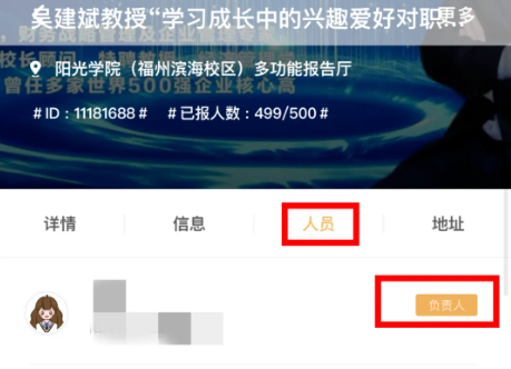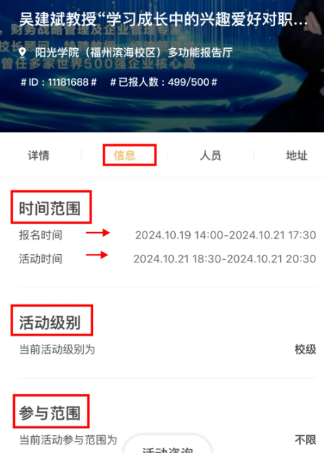 4、报名情况(已报名人数和限额)、活动联系人(活动负责人和组织者的信息及手机号)、活动部落(活动主办方部落)、活动详情。